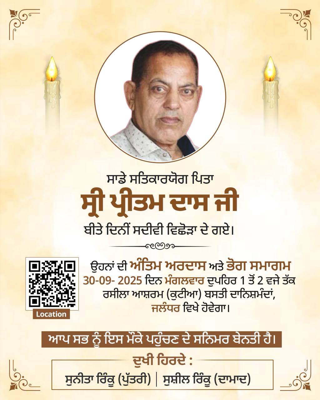 जालंधर, (मक्कड़)– पंजाब भाजपा के वरिष्ठ नेता और पूर्व सांसद सुशील रिंकू के ससुर और पूर्व पार्षद सुनीता रिंकू के पिता स्वर्गीय श्री प्रीतम दास जी की आत्मिक शांति के लिए अंतिम अरदास और भोग समागम आज मंगलवार 30 सितंबर 2025 को होगा।