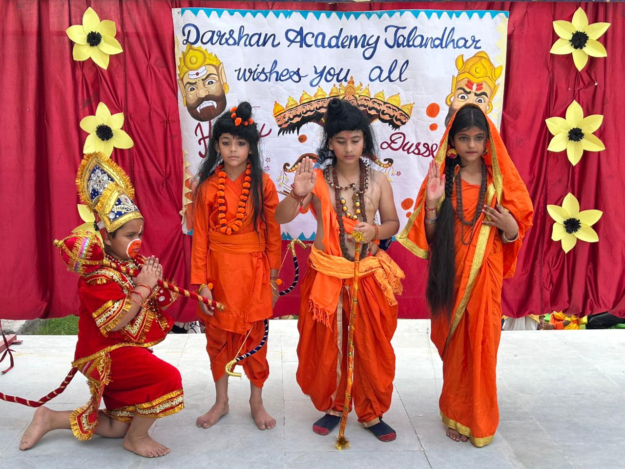 जालंधर (कुलविंदर) :- दर्शन अकैडमी, जालंधर में दशहरा पर्व बड़े ही धूमधाम और सांस्कृतिक उल्लास के साथ मनाया गया। इस अवसर पर विद्यालय परिसर भक्ति, रंगों और उत्साह से सराबोर हो गया।कार्यक्रम की शुरुआत छात्रा द्वारा हिंदी में दिए गए प्रेरणादायक भाषण से हुई, जिसमें उसने दशहरा के ऐतिहासिक और नैतिक महत्व को उजागर किया। इसके पश्चात विद्यार्थियों ने रामायण के विभिन्न प्रसंगों पर आधारित मनमोहक नाट्य प्रस्तुतियाँ दीं — जैसे सीता स्वयंवर, धनुष भंग, मारीच वध, सीता हरण, राम-हनुमान मिलन, राम-रावण युद्ध और रावण वध को दर्शाया। इन प्रस्तुतियों में बच्चों ने पारंपरिक वेशभूषा धारण कर पात्रों को जीवंत कर दिया, जिससे दर्शक भावविभोर हो उठे।