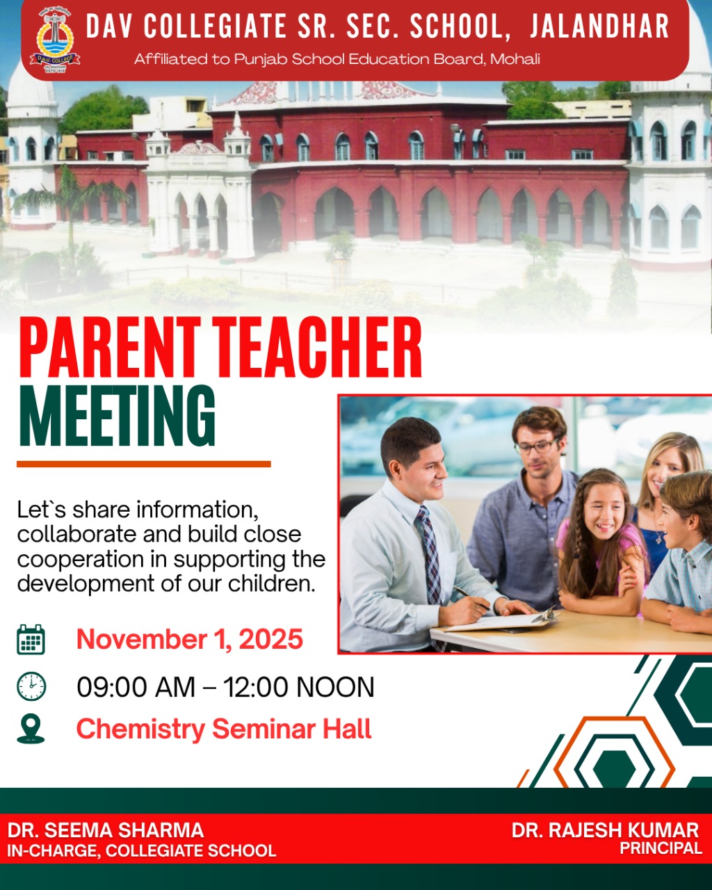 जालंधर (अरोड़ा) :- डी.ए.वी. कॉलेजिएट सीनियर सेकेंडरी स्कूल, जालंधर ने प्रधानाचार्य डॉ. राजेश कुमार के मार्गदर्शन में रसायन विज्ञान सेमिनार हॉल में कक्षा 10+1 और 10+2 (सभी स्ट्रीम) के छात्रों के लिए एक अभिभावक-शिक्षक बैठक का आयोजन किया। बैठक का उद्देश्य शिक्षकों और अभिभावकों को छात्रों की शैक्षणिक प्रगति पर चर्चा करने और उनके सीखने के अनुभव को बेहतर बनाने के तरीके खोजने के लिए एक मंच प्रदान करना था। कॉलेजिएट स्कूल की प्रोफेसर इंचार्ज डॉ. सीमा शर्मा द्वारा छात्रों के आधिकारिक समूह के माध्यम से बैठक की जानकारी पहले ही सांझा की गई थी। इस कार्यक्रम में लगभग 60% उपस्थिति दर्ज की गई, जो अभिभावकों की अपने बच्चों की प्रगति में रुचि को दर्शाता है। बैठक के दौरान, शिक्षकों ने अभिभावकों के साथ व्यक्तिगत रूप से बातचीत की और मिड-सेमेस्टर परीक्षा में छात्रों के प्रदर्शन पर चर्चा की।