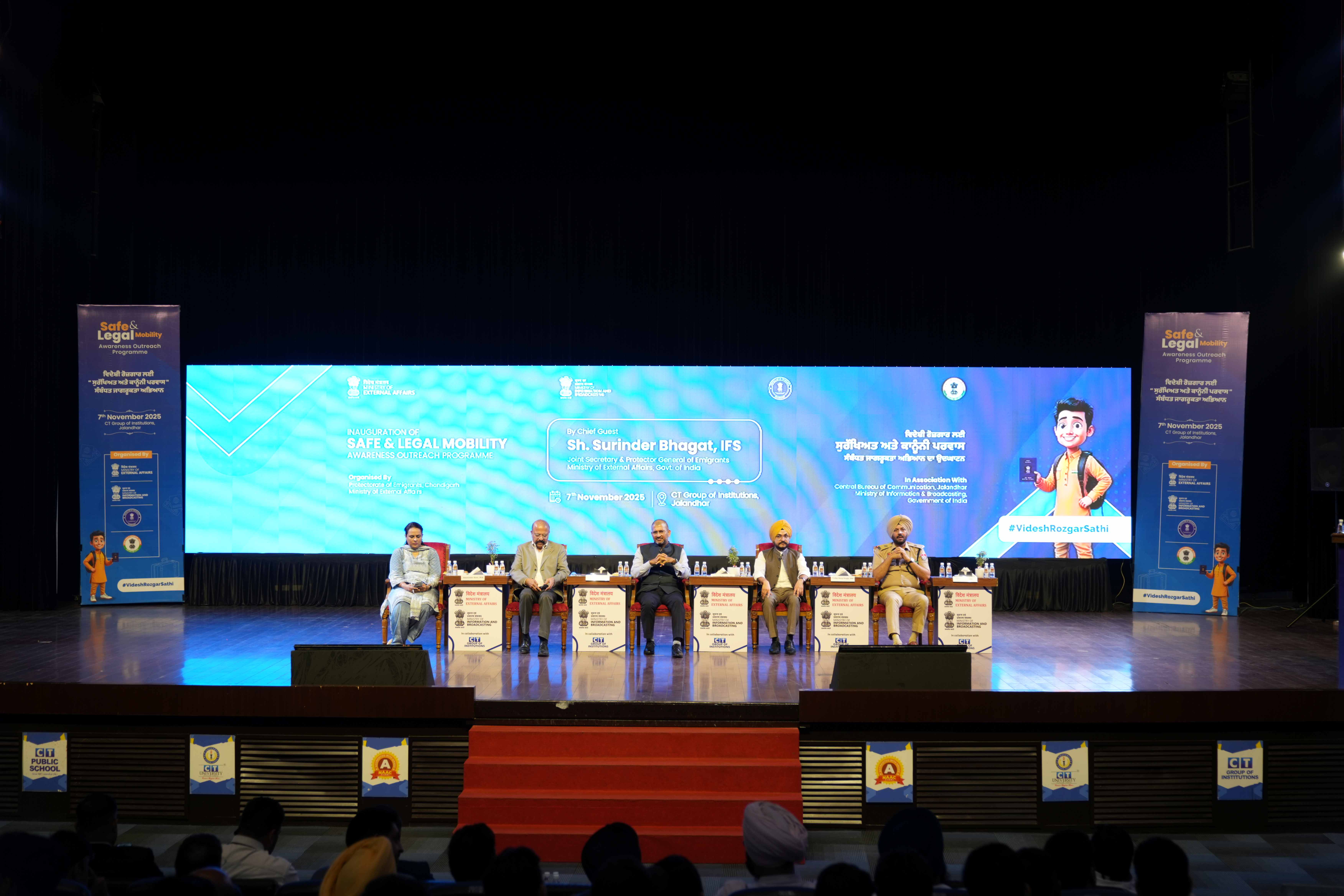 जालंधर (अरोड़ा) :- सी.टी. ग्रुप ऑफ इंस्टिट्यूशन्स, शाहपुर कैंपस ने विदेश मंत्रालय और सूचना एवं प्रसारण मंत्रालय के सहयोग से पंजाब का पहला “सेफ एंड लीगल मोबिलिटी अवेयरनेस आउटरीच प्रोग्राम” आयोजित किया। इस पहल का उद्देश्य छात्रों और युवाओं को सुरक्षित एवं कानूनी तरीकों से विदेश में रोजगार प्राप्त करने के मार्गों के बारे में शिक्षित और सशक्त बनाना था, ताकि वे जागरूक और जिम्मेदार प्रवासन के सिद्धांतों को अपनाएँ।