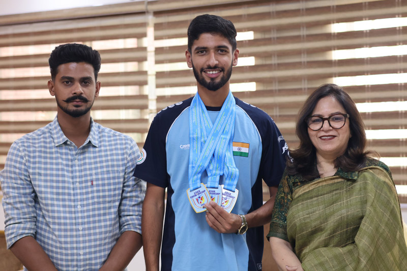 जालंधर (अरोड़ा) :- एपीजे कॉलेज ऑफ फाइन आर्ट्स जालंधर के विद्यार्थी प्रत्येक क्षेत्र में बुलंदियों को चूमने का हौसला रखते हुए कॉलेज को गौरवान्वित करते ही रहते हैं। इसी श्रृंखला में कॉलेज के बैचलर ऑफ डिजाइन पांचवें सेमेस्टर के विद्यार्थी हरमेहर सिंह लाली ने कजाकिस्तान में आयोजित एशियन शूटिंग चैंपियनशिप में स्कीट शूटिंग जूनियर टीम मैन में स्वर्ण पदक,स्कीट शूंटिंग जूनियर मिक्स टीम में स्वर्ण पदक एवं स्कीट शूटिंग जूनियर मैन इंडिविजुअल में रजत पदक प्राप्त करके न केवल कॉलेज का नाम रोशन किया बल्कि अपने अभिभावकों को भी गौरवान्वित किया। हरमेहर सिंह लाली ने नई दिल्ली में आयोजित इंटरनेशनल स्पोर्ट्स शूंटिंग फेडरेशन में अपनी टीम के साथ खेलते हुए जूनियर वर्ल्ड कप में चतुर्थ स्थान हासिल किया। डॉ नीरजा ढींगरा ने हरमेहर सिंह की शानदार उपलब्धियों पर बधाई देते हुए कहा कि हमें हमेशा से ही हरमेहर सिंह लाली पर गर्व रहा है और हम यही शुभकामना करते हैं कि वह भविष्य में भी वह स्कीट शूटिंग में अपनी प्रतिभा का शानदार प्रदर्शन करते हुए श्रेष्ठ स्थान को प्राप्त करता हुआ अपने देश का नाम विश्व स्तर पर रोशन करें। हरमेहर सिंह लाली को मार्गदर्शन देने के लिए उन्होंने फिजिकल एजुकेशन विभाग के प्राध्यापक साहिल महे के प्रयासों की भी सराहना की।