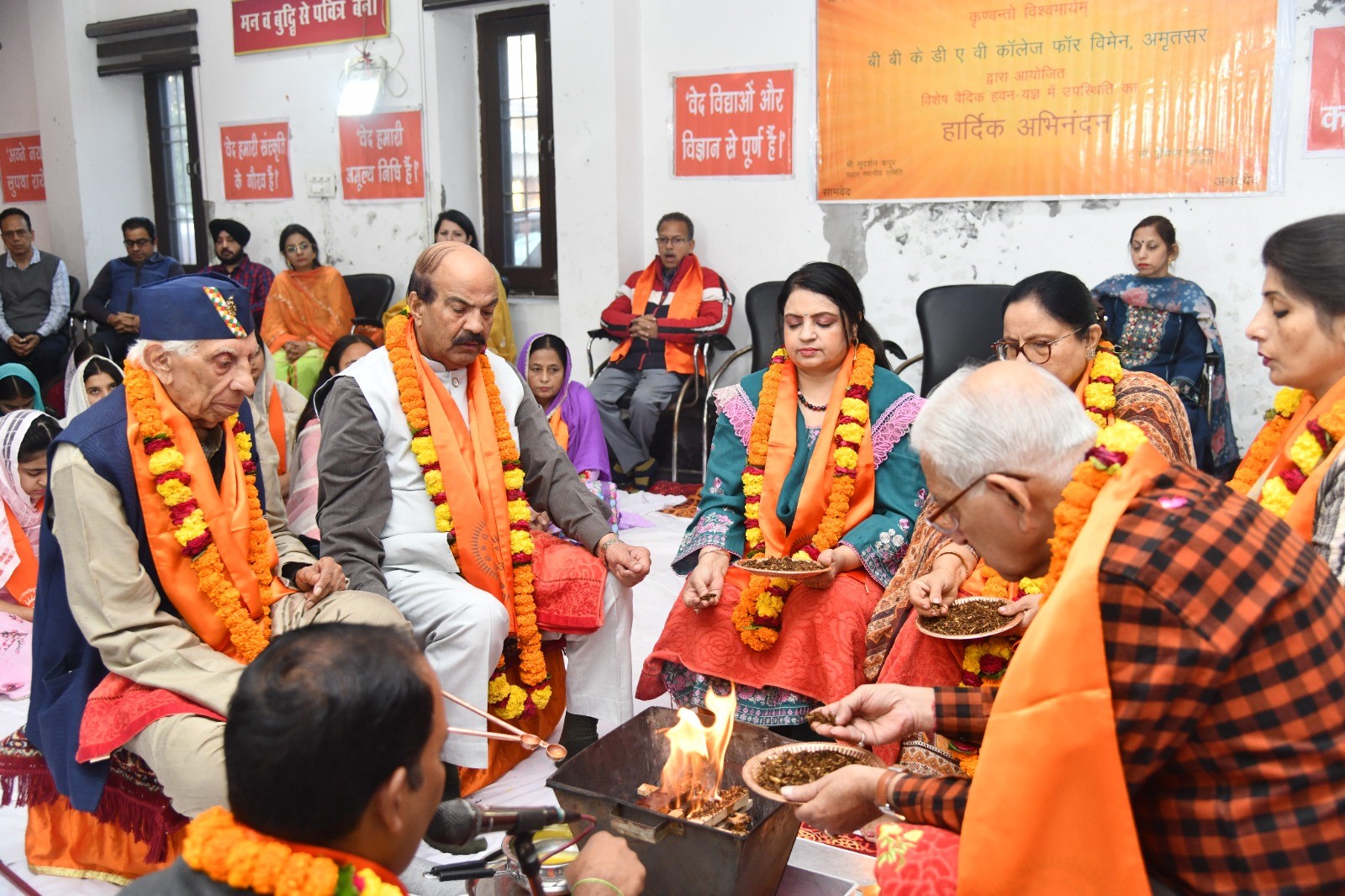 उन्होंने वर्ष 2025 में महाविद्यालय द्वारा सम्पन्न की गई वैदिक गतिविधियों एवं उपलब्धियों की विस्तृत जानकारी भी दी। जे.पी शूर ने अपने वक्तव्य में डॉ. पुष्पिंदर वालिया को इस भव्य आयोजन की हार्दिक बधाई दी और प्राचार्या महोदया की प्रशंसा करते हुए कहा कि शिक्षा के क्षेत्र में बी.बी.के डी.ए.वी कॉलेज का अपना एक विशेष स्थान है। आपने कहा कि महात्मा हंसराज के जीवनवृत्त को पढ़ने से यह ज्ञात होता है कि आर्य समाज का मुख्य मंतव्य आर्य बनना और बनाना है क्यूंकि इसी में विश्व का कल्याण निहित है। उल्लेखनीय है कि कॉलेज के संगीत विभाग द्वारा “ओम कहने से तर जाएगा, तेरा जीवन सँवर जाएगा..” मधुर भजन एवं डी ए वी पब्लिक स्कूल के संगीत विभाग द्वारा भी प्रस्तुति दे वातावरण को ओममय कर दिया। इस अवसर पर डॉ. पुष्पिंदर वालिया ने मुख्यातिथि एवं आर्य समाज के सदस्यों तथा अन्य अतिथियों को स्मृति चिह्न देकर सम्मानित किया। सुदर्शन कपूर जी द्वारा उपस्थिति का धन्यवाद किया गया। डॉ. अनीता नरेन्द्र, अध्यक्ष हिन्दी विभाग द्वारा कुशल मंच संचालन किया गया। इस आयोजन में स्थानीय समिति के सदस्य डॉ. अरविन्द शर्मा, अशोक कपूर जी, आर्य समाज शक्ति नगर से संदीप आहूजा, विजय कुमार, आर्य समाज लक्ष्मणसर से प्रधान इंद्रपाल आर्य, लॉरेंस रोड आर्य समाज से रवि मेहरा, सहित बलबीर कौर बेदी एवं प्रिं. डॉ. पल्लवी सेठी, डी ए वी पब्लिक स्कूल उपस्थित रहे। इस अवसर पर कॉलेज की आर्य युवती सभा के सभी सदस्य एवं ऑफिस बियरर्ज़ व छात्राओं ने बढ़चढ़ कर भाग लिया। अंत में ‘शान्ति पाठ’ से हवन यज्ञ ‘सम्पन्न हुआ।