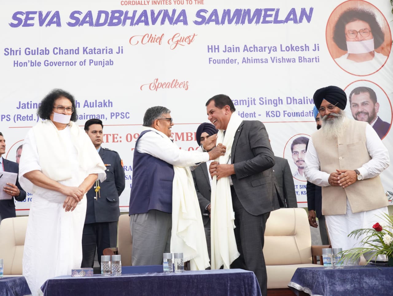 ਮੋਗਾ (ਵਿਮਲ) :- ਮੋਗਾ ਜ਼ਿਲ੍ਹੇ ਦੇ ਪਿੰਡ ਸੈਦੋਕੇ ਵਿੱਚ ਅੱਜ ਸੇਵਾ ਅਤੇ ਸਦਭਾਵਨਾ ਨੂੰ ਸਮਰਪਿਤ ਇੱਕ ਸੰਮੇਲਨ ਦਾ ਆਯੋਜਨ ਕੀਤਾ ਗਿਆ, ਜਿਸ ਵਿੱਚ ਪੰਜਾਬ ਦੇ ਮਾਨਯੋਗ ਗਵਰਨਰ ਸ਼੍ਰੀ ਗੁਲਾਬ ਚੰਦ ਕਟਾਰੀਆ ਨੇ ਵਿਸ਼ੇਸ਼ ਮਹਿਮਾਨ ਵਜੋਂ ਸ਼ਿਰਕਤ ਕੀਤੀ। ਇਸ ਸੰਮੇਲਨ ਦਾ ਆਯੋਜਨ ਪਿੰਡ ਸੈਦੋਕੇ ਦੇ ਵਾਸੀ ਅਤੇ ਪ੍ਰਸਿੱਧ ਐਨ.ਆਰ.ਆਈ. ਕਰਮਜੀਤ ਸਿੰਘ ਧਾਲੀਵਾਲ ਦੀ ਅਗਵਾਈ ਵਿੱਚ ਕੀਤਾ ਗਿਆ। ਪ੍ਰੋਗਰਾਮ ਵਿੱਚ ਵਿਧਾਇਕ ਨਿਹਾਲ ਸਿੰਘ ਵਾਲਾ ਸ੍ਰ ਮਨਜੀਤ ਸਿੰਘ ਬਿਲਾਸਪੁਰ, ਐਚ.ਐਚ. ਜੈਨ ਆਚਾਰਯ ਲੋਕੇਸ਼ ਅਤੇ ਸਾਬਕਾ ਆਈ.ਪੀ.ਐਸ. ਅਧਿਕਾਰੀ ਜਤਿੰਦਰ ਸਿੰਘ ਔਲਖ ਨੇ ਵੀ ਆਪਣੀ ਹਾਜ਼ਰੀ ਭਰੀ। ਪਿੰਡ ਸੈਦੋਕੇ ਵਿੱਚ ਆਯੋਜਿਤ ਸੇਵਾ ਸਦਭਾਵਨਾ ਸੰਮੇਲਨ ਨੂੰ ਸੰਬੋਧਨ ਕਰਦਿਆਂ ਕਿਹਾ ਕਿ ਕਰਮਜੀਤ ਸਿੰਘ ਧਾਲੀਵਾਲ ਇੱਕ ਉੱਘੇ ਸਮਾਜ ਸੇਵੀ ਹਨ ਅਤੇ ਅਜਿਹੇ ਲੋਕਾਂ ਦੇ ਕੰਮਾਂ ਵਿੱਚ ਹਰ ਕਿਸੇ ਨੂੰ ਸਾਥ ਦੇਣਾ ਚਾਹੀਦਾ ਹੈ। ਉਨ੍ਹਾਂ ਨੇ ਕਿਹਾ, “ਮੈਂ ਇਸੇ ਸੋਚ ਨਾਲ ਮੋਗਾ ਦੇ ਇਸ ਛੋਟੇ ਜਿਹੇ ਪਿੰਡ ਵਿੱਚ ਪਹੁੰਚਿਆ ਹਾਂ, ਜਿੱਥੋਂ ਵੱਡੇ ਪੱਧਰ ‘ਤੇ ਸੇਵਾ ਦਾ ਕੰਮ ਹੋ ਰਿਹਾ ਹੈ।” ਉਨ੍ਹਾਂ ਨੇ ਦੱਸਿਆ ਕਿ ਐਚ.ਐਚ. ਜੈਨ ਆਚਾਰਯ ਲੋਕੇਸ਼ ਅਤੇ ਐਨ.ਆਰ.ਆਈ. ਕਰਮਜੀਤ ਸਿੰਘ ਧਾਲੀਵਾਲ ਦੀ ਅਗਵਾਈ ਹੇਠ ਚੱਲ ਰਹੀ ਅਹਿੰਸਾ ਵਿਸ਼ਵ ਭਾਰਤੀ ਅਤੇ ਕਰਮਜੀਤ ਸਿੰਘ ਧਾਲੀਵਾਲ ਫ਼ਾਊਂਡੇਸ਼ਨ ਦੁਨੀਆ ਭਰ ਵਿੱਚ ਮਨੁੱਖਤਾ ਦੀ ਸੇਵਾ ਲਈ ਕੰਮ ਕਰ ਰਹੀ ਹੈ।