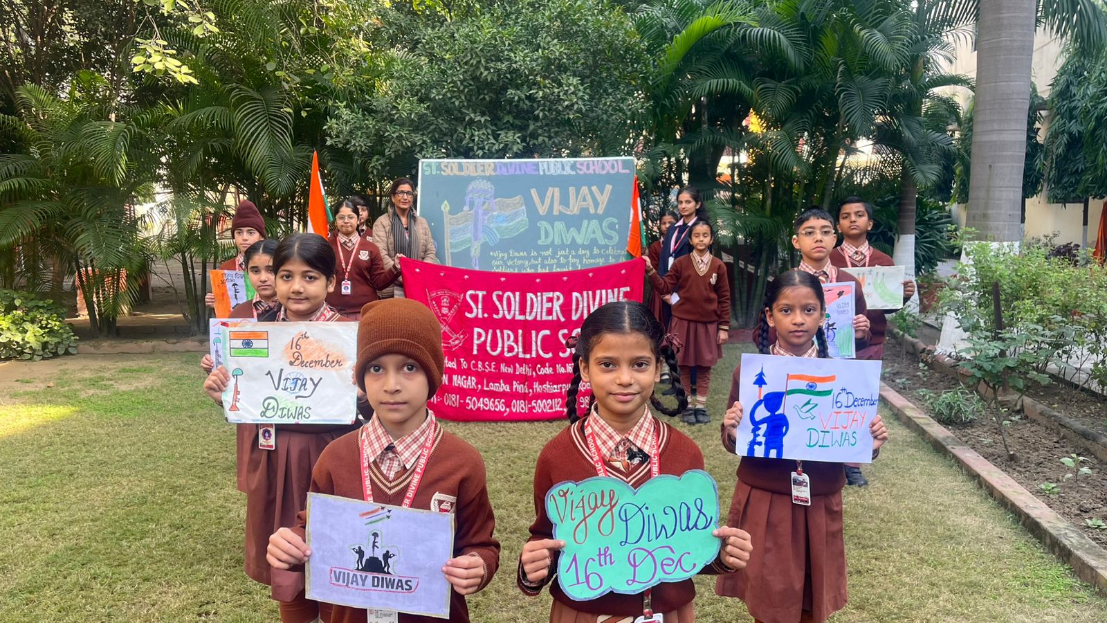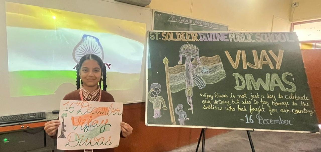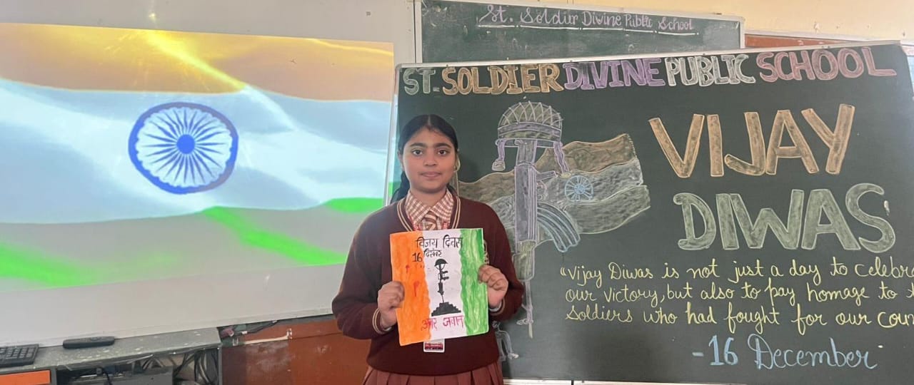 जालंधर (अजय छाबड़ा) :- सेंट सोल्जर डिवाइन पब्लिक स्कूल, अर्जुन नगर, जालंधर ने बड़े उत्साह के साथ विजय दिवस मनाया। शिक्षकों ने प्रेरणादायक भाषण दिए, जिसमें इस दिन के महत्व पर प्रकाश डाला गया। प्रिंसिपल श्रीमती मंगला शर्मा ने हमारे बहादुर सैनिकों की बहादुरी और विजय दिवस के महत्व पर बहुमूल्य बातें बताईं।