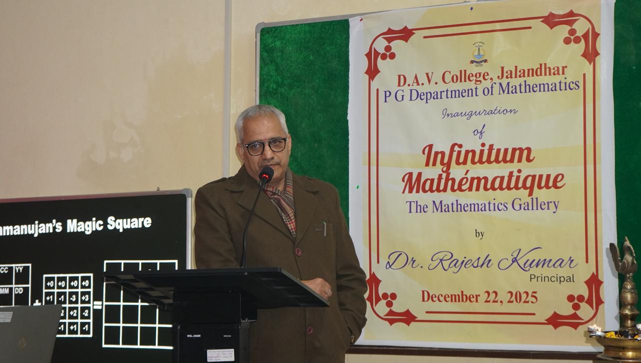 जालंधर (अरोड़ा) :- स्नातकोत्तर गणित विभाग ने राष्ट्रीय गणित दिवस, 22 दिसंबर 2025 के अवसर पर डीबीटी द्वारा प्रायोजित गणित गैलरी, इनफिनिटम मैथेमेटिक को शैक्षणिक समुदाय को समर्पित किया। गैलरी का औपचारिक उद्घाटन प्राचार्य डॉ. राजेश कुमार ने किया, जिन्होंने गैलरी पट्टिका का अनावरण किया और रिबन काटने की रस्म अदा की। उद्घाटन कार्यक्रम में वरिष्ठ उप-प्राचार्य डॉ. कुॅंवर राजीव और उप- प्राचार्या प्रोफेसर सोनिका दानिया; समग्र डीबीटी समन्वयक डॉ. पुनीत पुरी; रजिस्ट्रार प्रोफेसर अशोक कपूर; उप रजिस्ट्रार प्रोफेसर मनीष खन्ना; और गणित विभाग के पूर्व विभागाध्यक्ष डॉ. एस. के. तुली, साथ ही विभिन्न विभागों के विभागाध्यक्ष, संकाय सदस्य और छात्र उपस्थित थे। श्रीनिवास रामानुजन की जयंती के उपलक्ष्य में, प्रोफेसर मोनिश अरोरा और प्रोफेसर साहिल नागपाल (अध्यक्ष, बंसीलाल गणितीय सोसायटी) ने विशेष रूप से “रामानुजन वॉक” का आयोजन किया, जिसमें उनके जीवन और गणित में उनके प्रमुख योगदानों को दर्शाया गया। कार्यक्रम का शुभारंभ डी.ए.वी. गान से हुआ, जिसके बाद गणमान्य व्यक्तियों द्वारा दीप प्रज्वलन किया गया।