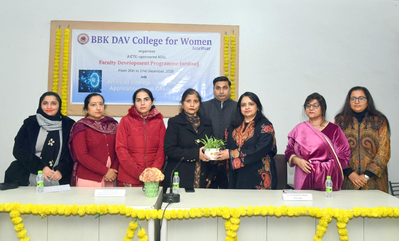 अमृतसर (प्रदीप) :- बी बी के डी ए वी कॉलेज फॉर विमेन ने आर्टिफिशियल इंटेलिजेंस: कॉन्सेप्ट्स, एप्लीकेशंस एंड चैलेंजेस पर अपने छह-दिवसीय ए आई सी टी ई-स्पॉन्सर्ड अटल फैकल्टी डेवलपमेंट प्रोग्राम के समापन के अवसर पर एक विदाई समारोह का आयोजन किया।इस समारोह की मुख्य अतिथि गुरु नानक देव यूनिवर्सिटी, अमृतसर की कॉलेज डेवलपमेंट काउंसिल की डीन प्रो (डॉ) सरोज बाला रहीं। प्रिंसिपल डॉ पुष्पिन्दर वालिया ने एफ डी पी का हिस्सा बनने के लिए सभी गणमान्य व्यक्तियों और रिसोर्स पर्सन को धन्यवाद दिया। प्रतिभागियों को एफ डी पी के सफल समापन पर बधाई देते हुए उन्होंने कहा कि यह कार्यक्रम उन्हें शिक्षण और अनुसंधान में उत्कृष्टता प्राप्त करने के लिए नवीन शैक्षणिक दृष्टिकोण, समकालीन अंतर्दृष्टि और नए सिरे से प्रेरणा प्रदान करेगा। प्रो. (डॉ.) सरोज बाला ने प्रतिभागियों को संबोधित करते हुए कहा कि तेजी से बदलते शैक्षणिक परिदृश्य में, फैकल्टी सदस्यों को महत्वपूर्ण समझ, नैतिक जागरूकता और शैक्षणिक उत्कृष्टता के प्रति प्रतिबद्धता के साथ आर्टिफिशियल इंटेलिजेंस जैसी उभरती प्रौद्योगिकियों को अपनाना चाहिए।