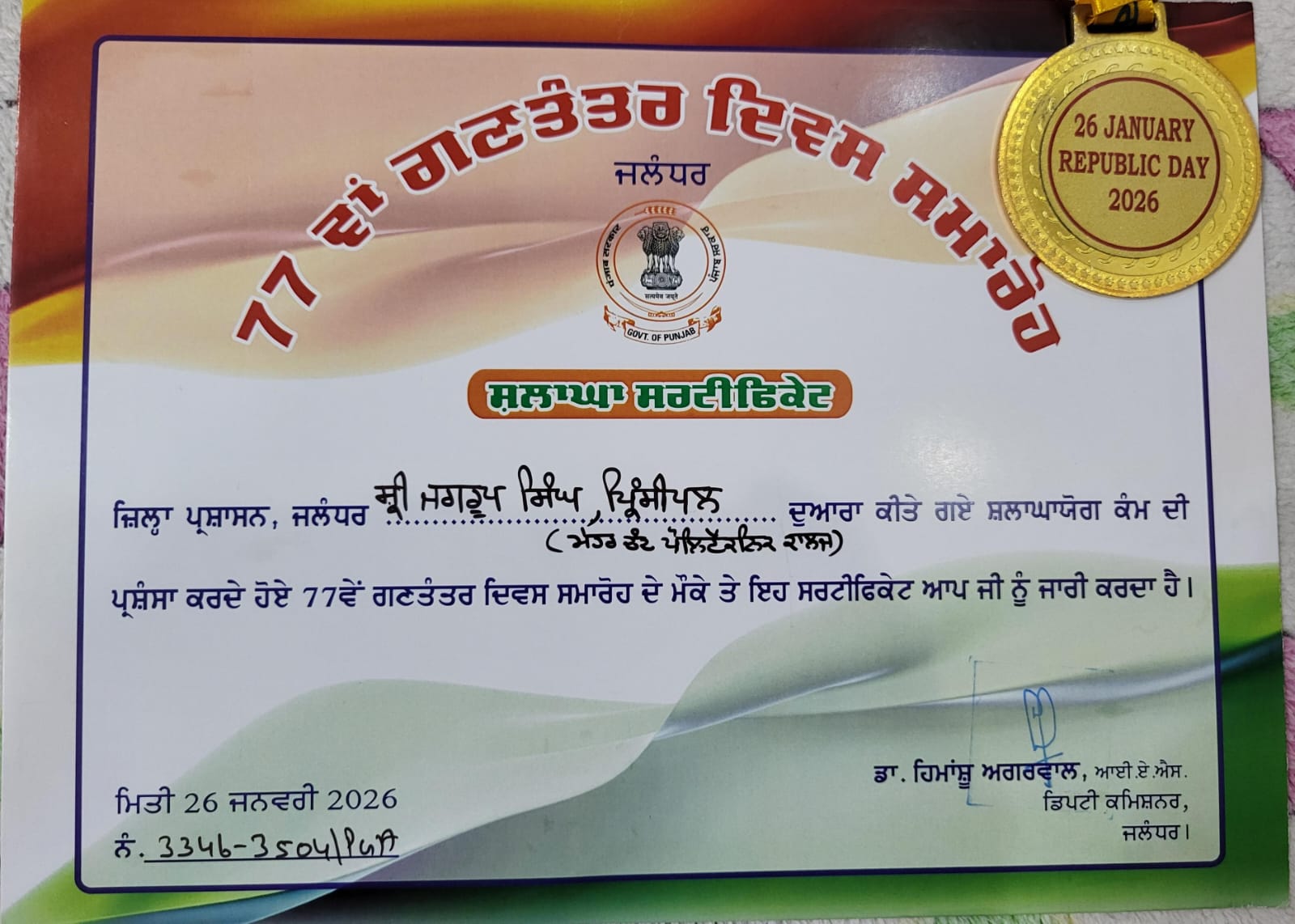 जालंधर (अरोड़ा) :- मेहरचंद पॉलिटेक्निक कॉलेज, जालंधर के प्रिंसिपल डॉ. जगरूप सिंह को देश के 77वें गणतंत्र दिवस के अवसर पर तकनीकी शिक्षा के क्षेत्र में उल्लेखनीय उपलब्धियों के लिए 26 जनवरी को गुरु गोबिंद सिंह स्टेडियम में सम्मानित किया गया। यह सम्मान कैबिनेट मंत्री बरिंदर गोयल, राज्यसभा सदस्य संत सीचेवाल, करतारपुर के विधायक बलकार सिंह, डिप्टी कमिश्नर जालंधर डॉ. हिमांशु अग्रवाल, पुलिस कमिश्नर धनप्रीत कौर तथा ए.डी.सी. मैडम अमनिंदर बराड़ द्वारा प्रदान किया गया। उल्लेखनीय है कि इस वर्ष न केवल डॉ. जगरूप सिंह को आई.एस.टी.ई., नई दिल्ली द्वारा बेस्ट पॉलिटेक्निक प्रिंसिपल का राष्ट्रीय पुरस्कार प्रदान किया गया, बल्कि इसी वर्ष निट्टर, चंडीगढ़ द्वारा मेहरचंद पॉलिटेक्निक कॉलेज, जालंधर को भी राष्ट्रीय स्तर पर सर्वश्रेष्ठ पॉलिटेक्निक कॉलेज के पुरस्कार से सम्मानित किया गया, जो एक विशिष्ट उपलब्धि है।