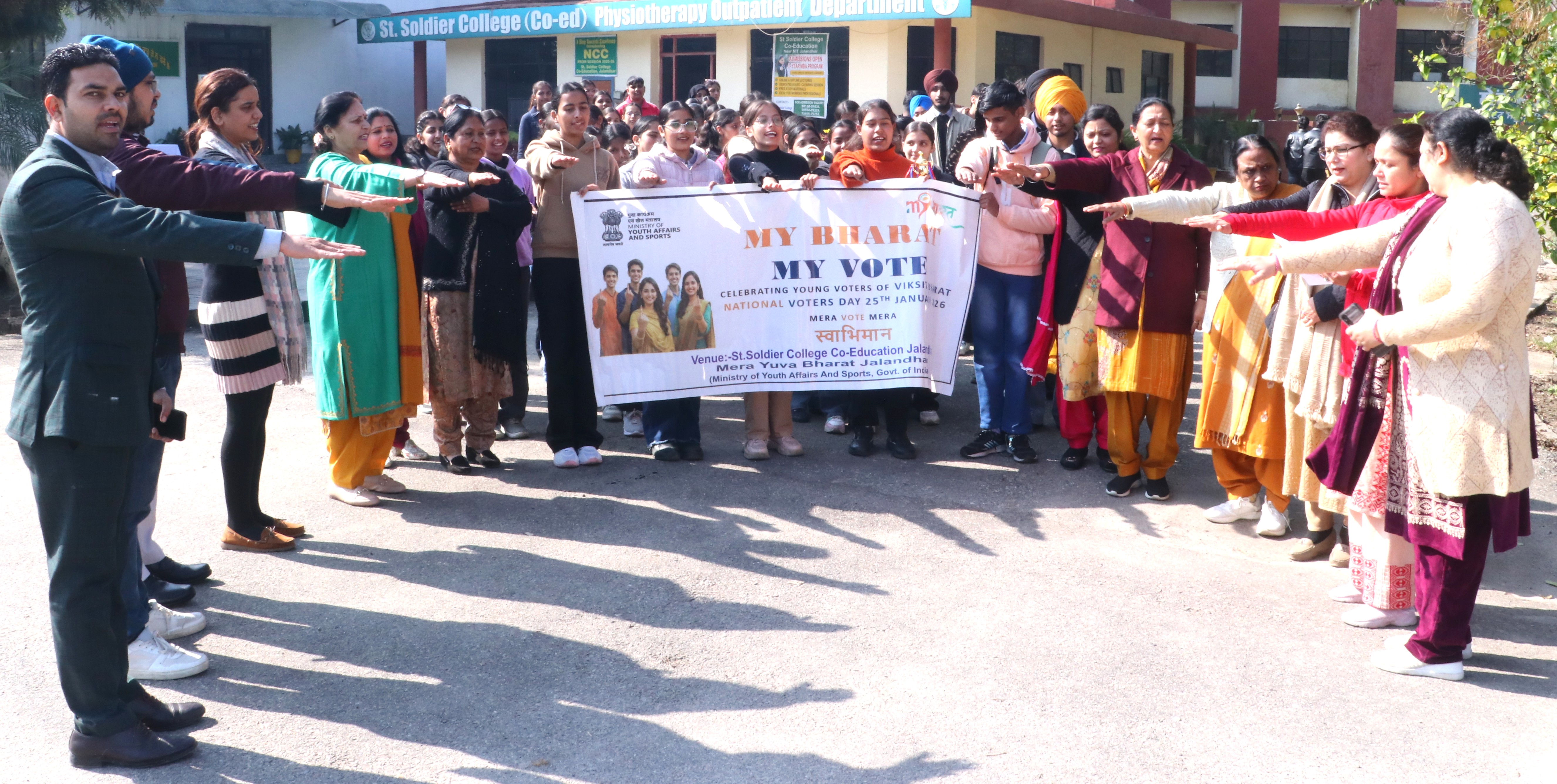 जालंधर (अजय छाबड़ा) :- सेंट सोल्जर कॉलेज (को-एजुकेशन), जालंधर की एन.एस.एस. यूनिट ने वोटर जागरूकता रैली का आयोजन किया। यह रैली माई भारत पोर्टल (युवा मामले और खेल मंत्रालय, भारत सरकार) के माध्यम से आयोजित की गई थी। माई भारत की डायरेक्टर, रश्मीत कौर, मुख्य अतिथि के रूप में इस अवसर पर मौजूद थीं। छात्रों को संबोधित करते हुए उन्होंने कहा कि युवा दिवस मनाने और वोटर जागरूकता रैलियों का आयोजन करने का उद्देश्य युवाओं को उनके अधिकारों और जिम्मेदारियों के बारे में जागरूक करना और उन्हें राष्ट्र निर्माण में भाग लेने के लिए प्रोत्साहित करना है। माई भारत टीम से गौरव और कुलविंदर सिंह भी इस अवसर पर उपस्थित थे।