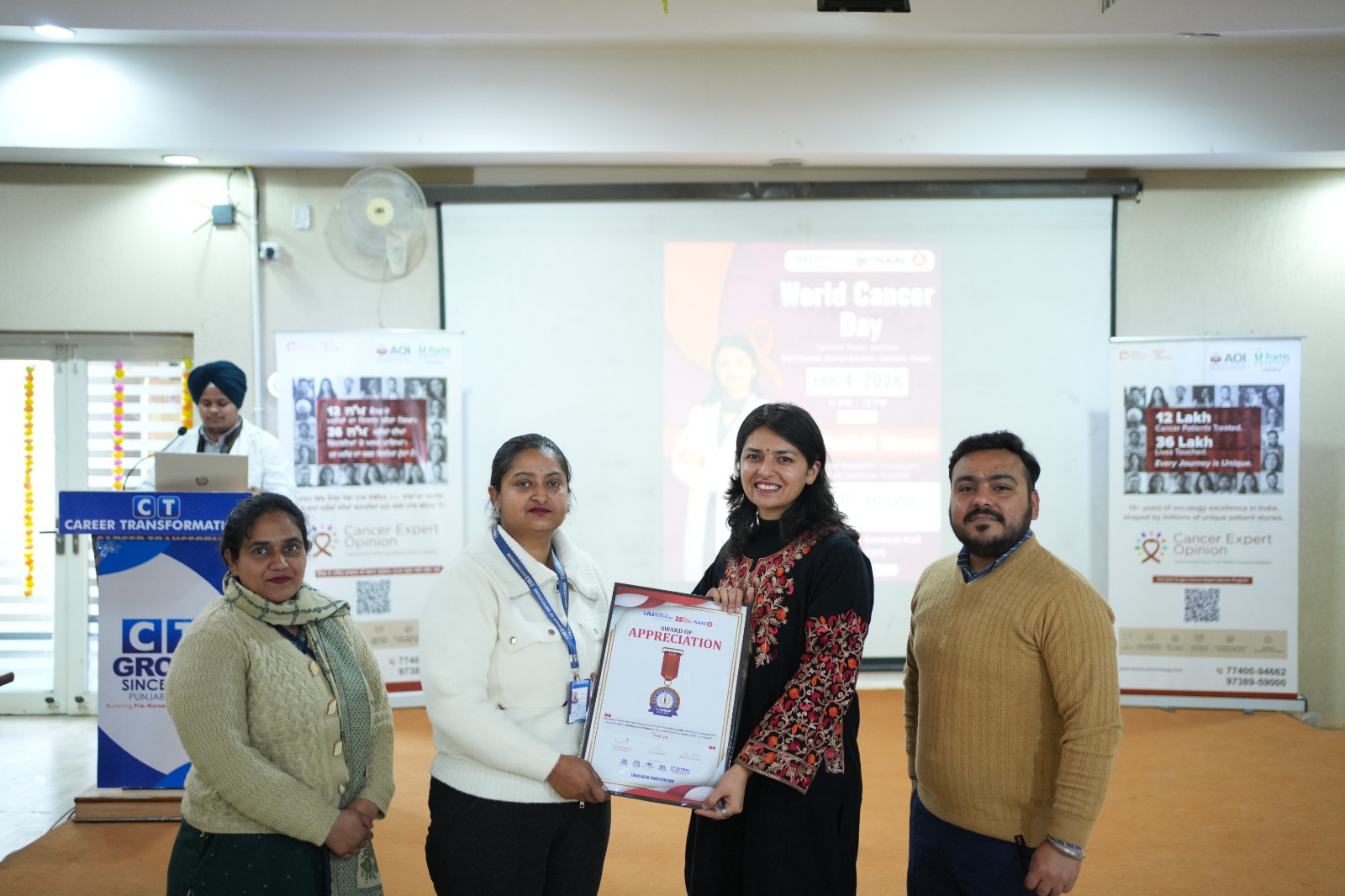 जालंधर (अरोड़ा) :- विश्व कैंसर दिवस के अवसर पर सीटी ग्रुप ऑफ इंस्टीट्यूशंस, शाहपुर कैंपस द्वारा एक विशेष जागरूकता एवं शैक्षणिक कार्यक्रम का आयोजन किया गया। यह कार्यक्रम यूनियन फॉर इंटरनेशनल कैंसर कंट्रोल के वैश्विक स्वास्थ्य लक्ष्यों के समर्थन में सीटी कॉलेज ऑफ फार्मेसी और सीटी इंस्टीट्यूट ऑफ फार्मास्यूटिकल साइंसेज के संयुक्त सहयोग से संपन्न हुआ। कार्यक्रम में चिकित्सा विशेषज्ञों, संस्थान के अधिकारियों, शिक्षकों और छात्रों ने उत्साहपूर्वक भाग लिया। इस अवसर पर छात्रों को कैंसर से जुड़ी महत्वपूर्ण जानकारी देने के लिए विशेषज्ञ व्याख्यान आयोजित किए गए।