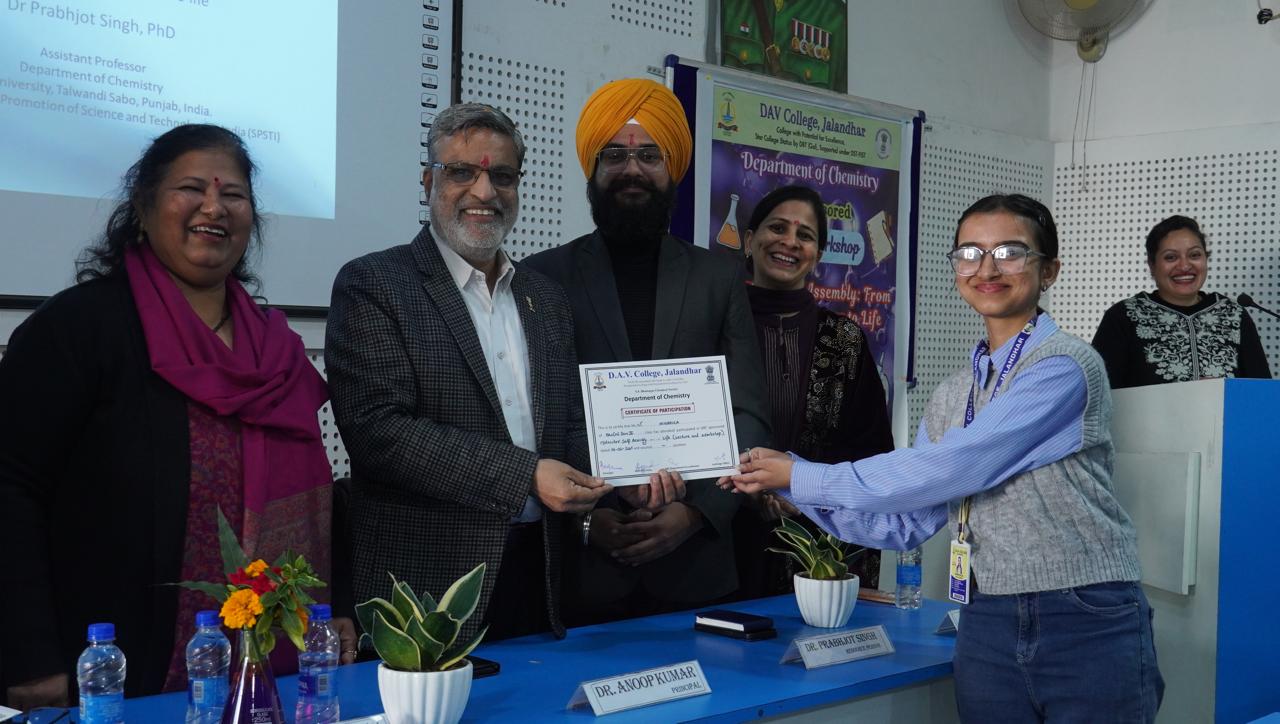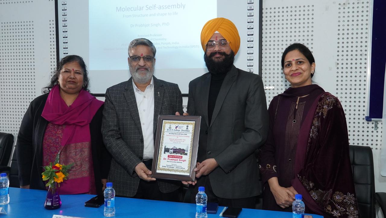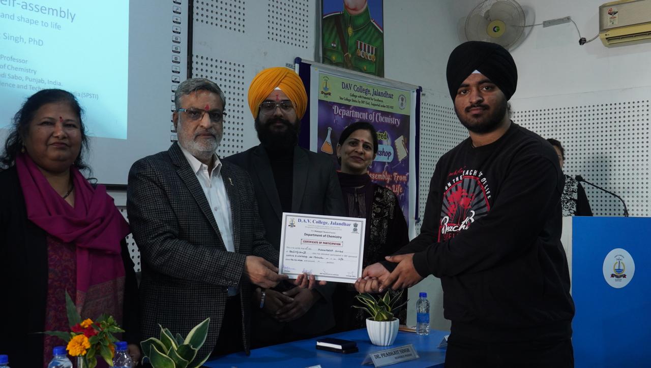 जालंधर (अरोड़ा) :- DBT-स्पॉन्सर्ड लेक्चर और वर्कशॉप “मॉलिक्यूलर सेल्फ-असेंबली: शेप और स्ट्रक्चर से जीवन तक” पर केमिस्ट्री डिपार्टमेंट ने सफलतापूर्वक ऑर्गनाइज़ किया। यह सेशन अकाल यूनिवर्सिटी, बठिंडा के डॉ. प्रभजोत सिंह ने दिया, जिन्होंने मॉलिक्यूलर सेल्फ-असेंबली के प्रिंसिपल्स और एप्लीकेशन्स के बारे में गहरी जानकारी दी। लेक्चर के दौरान, डॉ. सिंह ने मॉलिक्यूलर सेल्फ-असेंबली के फंडामेंटल प्रिंसिपल्स के बारे में पूरी जानकारी दी, और जीवन के लिए ज़रूरी कॉम्प्लेक्स, ऑर्डर्ड स्ट्रक्चर्स बनाने में इसकी अहम भूमिका पर ज़ोर दिया। उन्होंने बताया कि कैसे स्पॉन्टेनियस सुपरमॉलिक्यूलर असेंबलीज़ – जैसे सेल मेम्ब्रेन में लिपिड बाइलेयर्स – सिंपल मॉलिक्यूलर इंटरैक्शन से बनती हैं और प्रीबायोटिक इवोल्यूशन में सेल्फ-असेंबली के महत्व पर ज़ोर दिया, जहाँ इसने शुरुआती बायोलॉजिकल कंपाउंड्स के बनने में मदद की होगी।