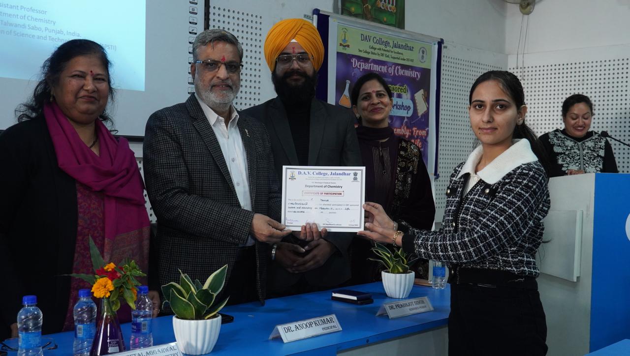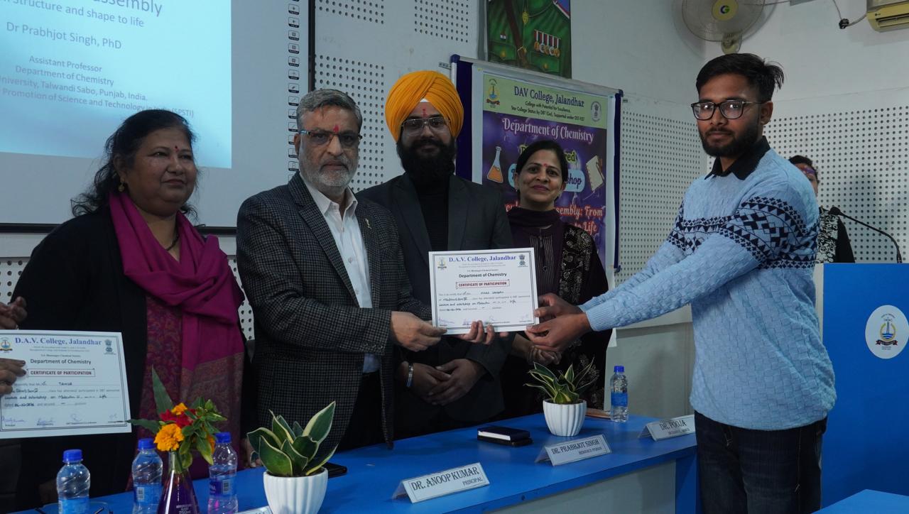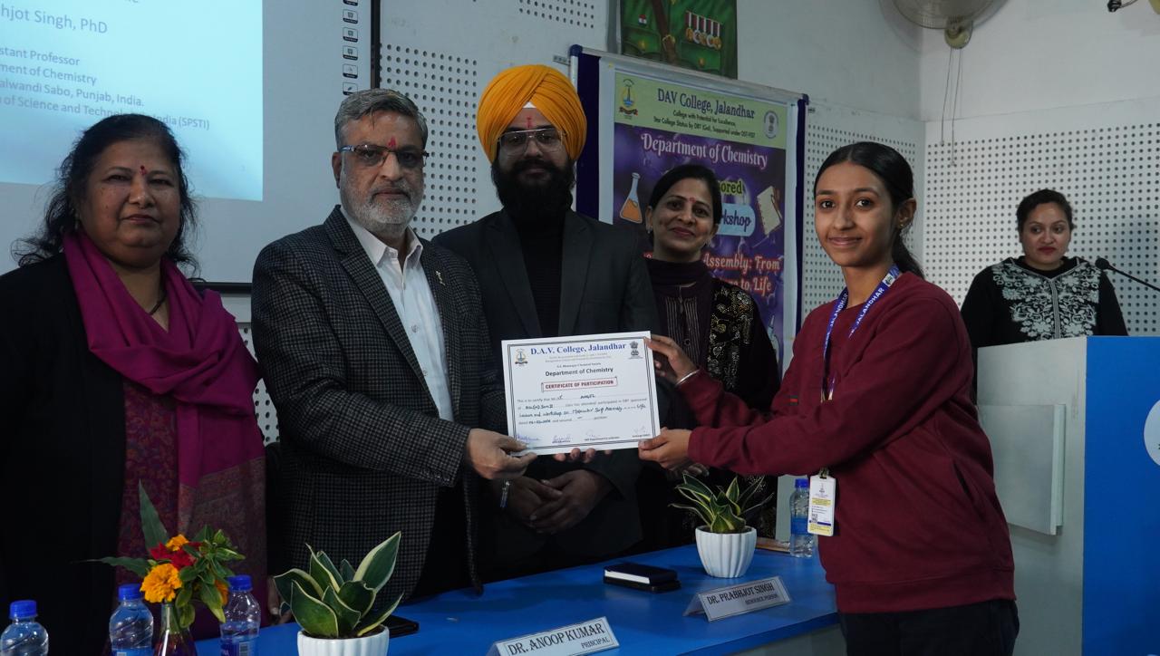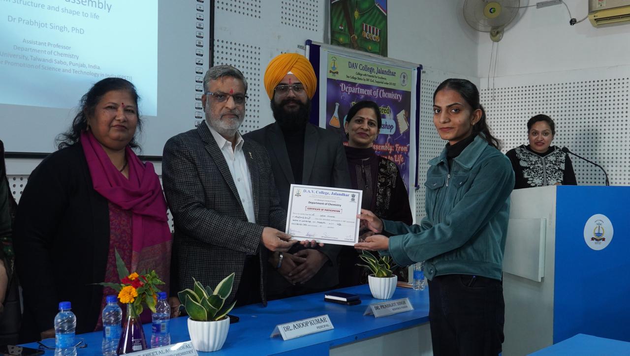 जालंधर (अरोड़ा) :- DBT-स्पॉन्सर्ड लेक्चर और वर्कशॉप “मॉलिक्यूलर सेल्फ-असेंबली: शेप और स्ट्रक्चर से जीवन तक” पर केमिस्ट्री डिपार्टमेंट ने सफलतापूर्वक ऑर्गनाइज़ किया। यह सेशन अकाल यूनिवर्सिटी, बठिंडा के डॉ. प्रभजोत सिंह ने दिया, जिन्होंने मॉलिक्यूलर सेल्फ-असेंबली के प्रिंसिपल्स और एप्लीकेशन्स के बारे में गहरी जानकारी दी। लेक्चर के दौरान, डॉ. सिंह ने मॉलिक्यूलर सेल्फ-असेंबली के फंडामेंटल प्रिंसिपल्स के बारे में पूरी जानकारी दी, और जीवन के लिए ज़रूरी कॉम्प्लेक्स, ऑर्डर्ड स्ट्रक्चर्स बनाने में इसकी अहम भूमिका पर ज़ोर दिया। उन्होंने बताया कि कैसे स्पॉन्टेनियस सुपरमॉलिक्यूलर असेंबलीज़ – जैसे सेल मेम्ब्रेन में लिपिड बाइलेयर्स – सिंपल मॉलिक्यूलर इंटरैक्शन से बनती हैं और प्रीबायोटिक इवोल्यूशन में सेल्फ-असेंबली के महत्व पर ज़ोर दिया, जहाँ इसने शुरुआती बायोलॉजिकल कंपाउंड्स के बनने में मदद की होगी।