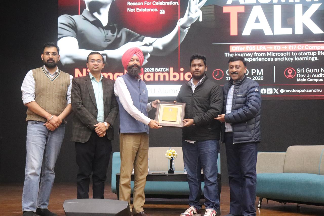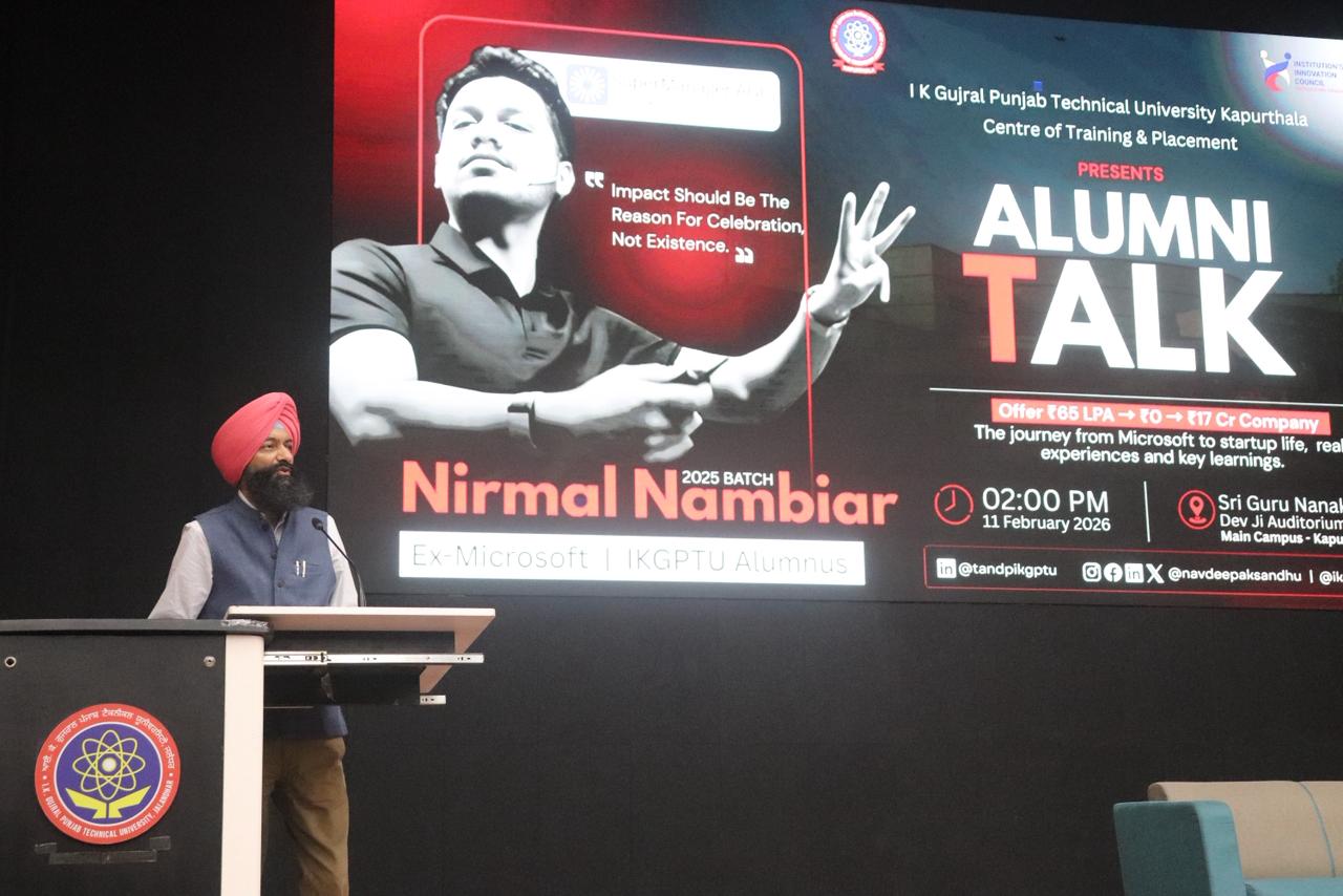 जालंधर (अरोड़ा) :- सेंटर ऑफ़ ट्रेनिंग एंड प्लेसमेंट, आई.के. गुजराल पंजाब टेक्निकल यूनिवर्सिटी (आई.के.जी पी.टी.यू) ने इंस्टीट्यूशन की इनोवेशन काउंसिल के साथ मिलकर मुख्य कैंपस के श्री गुरु नानक देव जी ऑडिटोरियम में एक जानकारी भरपूर एवं प्रेरणादायक एलुमनाई टॉक का आयोजन किया। इस टॉक सेशन में निर्मल नांबियार, फाउंडर एवं सी.ई.ओ, ए.आई एंटरप्रेन्योर एवं एक्स-माइक्रोसॉफ्ट प्रोडक्ट मैनेजर बतौर मुख्य वक्ता शामिल हुए! निर्मल नांबियार यूनिवर्सिटी के मोहाली कैम्पस के विद्यार्थी रहे हैं , जिन्हें ₹65 लाख सालाना कॉर्पोरेट रोल पाने से लेकर ग्लोबल क्लाइंट्स के साथ काम करते हुए अपना खुद का वेंचर बनाने तक का तजुर्बा है! उन्होंने अपने सफर एवं उसके अनुभव को साँझा किया! यह प्रोग्राम यूनिवर्सिटी के कुलपति प्रोफ़ेसर (डॉ.) सुशील मित्तल के योग्य नेतृत्व में करवाया गया! इसमें यूनिवर्सिटी के रजिस्ट्रार कम डिप्टी डायरेक्टर (सी.आर एंड ए) डॉ. नवदीपक संधू ने कीनोट एड्रेस मंच से साँझा किया।
