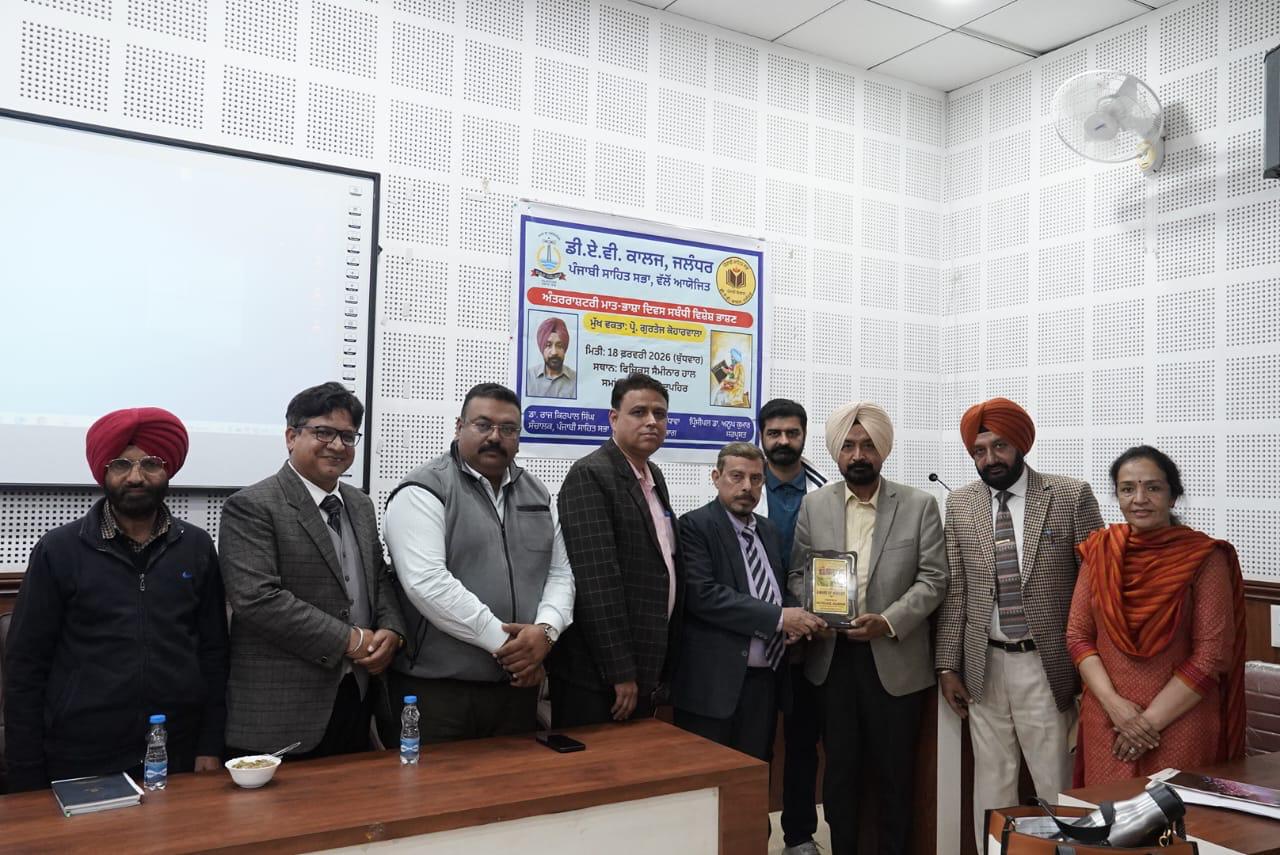 जालंधर (अरोड़ा) :- ​डीएवी कॉलेज, जालंधर की पंजाबी साहित्य सभा ने 18 फरवरी, 2026 को अंतर-राष्ट्रीय मातृभाषा दिवस के उपलक्ष्य पर विशेष व्याख्यान आयोजित किया। जिसमें प्रसिद्ध पंजाबी कवि प्रो. गुरतेज कोहारवाला मुख्य वक्ता के तौर पर उपस्थित हुए। कार्यक्रम का आरंभ डीएवी गान से हुआ। मुख्य वक्ता को माला पहनाने के बाद, पंजाबी-विभाग के अध्यक्ष प्रो. सुखदेव सिंह रंधावा ने वक्ता का औपचारिक स्वागत किया और उनकी काव्य-प्रतिभा पर प्रकाश डाला। इस मौके पर वक्ता को एक यादगार सम्मान चिह्न भेंट किया गया। कार्यकारी प्रिंसिपल डॉ. कुंवर राजीव ने भी मातृभाषा के महत्व बताते हुए पंजाबी विभाग को ऐसे सार्थक कार्यक्रम के लिए हार्दिक बधाई दी। मुख्य वक्ता के तौर पर बोलते हुए प्रो. गुरतेज कोहारवाला ने कहा कि आज के समय में भाषा सिर्फ़ संचार का मध्यम ही नहीं है, बल्कि प्रतिरोध का भी एक साधन है।