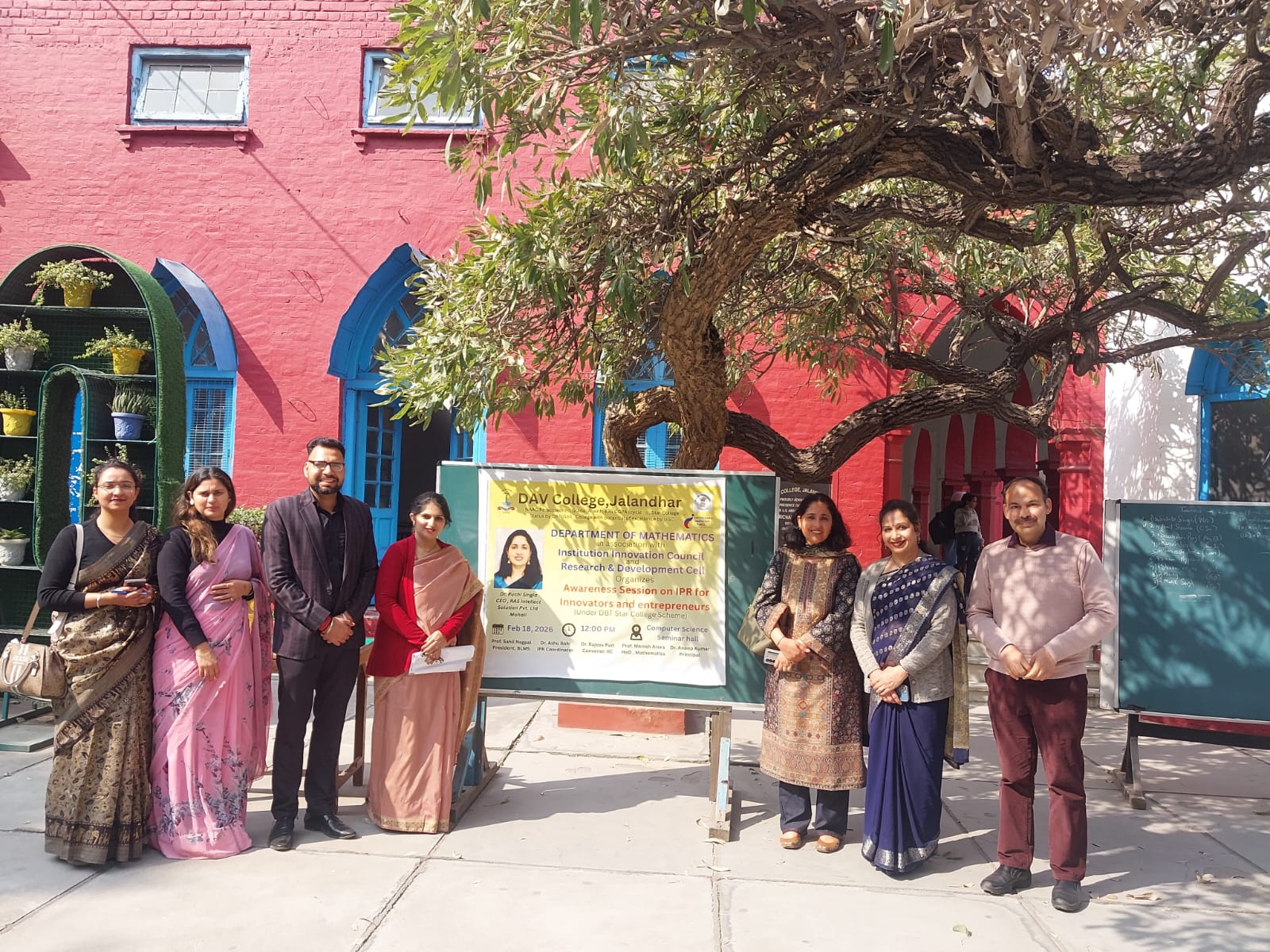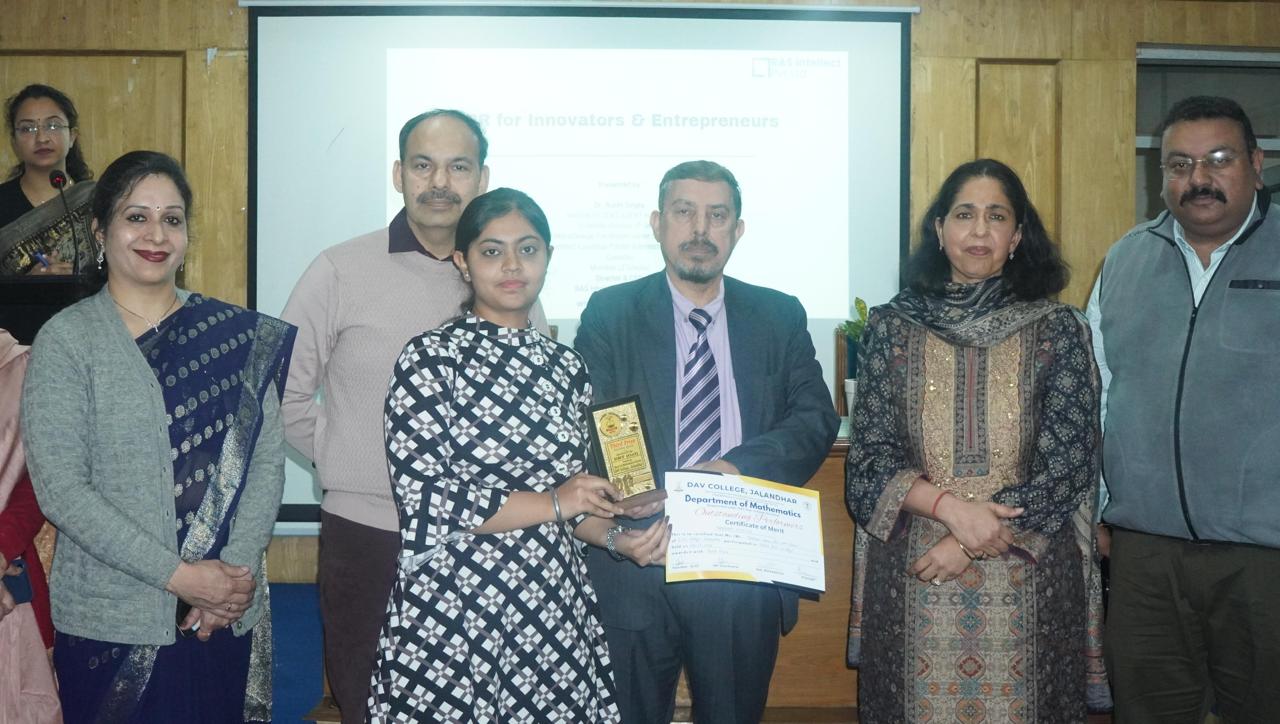 जालंधर (अरोड़ा) :- मैथमेटिक्स डिपार्टमेंट ने इंस्टीट्यूशन की इनोवेशन काउंसिल (IIC) और डी.ए.वी.कॉलेज के रिसर्च एंड डेवलपमेंट सेल के साथ मिलकर डी.बी.टी. स्टार कॉलेज स्कीम के तहत “इनोवेटर्स और एंटरप्रेन्योर्स के लिए आई.पी.आर. ” पर एक अवेयरनेस सेशन ऑर्गनाइज़ किया। मुख्य वक्ता आर.ए.एस. इंटेलेक्ट सॉल्यूशन प्राइवेट लिमिटेड की सी.ओ. डॉ. रुचि सिंगला थीं, जो इंटेलेक्चुअल प्रॉपर्टी राइट्स और इनोवेशन मैनेजमेंट की एक्सपर्ट हैं। उनका ग्रीन वेलकम किया गया और ऑफिसिएटिंग प्राचार्य डॉ. कुॅंवर राजीव और डिपार्टमेंट ऑफ़ डिपार्टमेंट प्रो. मोनीश अरोड़ा ने उन्हें एक मेमेंटो दिया। प्रोग्राम की शुरुआत डी.ए.वी.गान से हुई, जिसके बाद रिसोर्स पर्सन का फॉर्मल इंट्रोडक्शन हुआ। अपने एड्रेस में, ऑफिसिएटिंग प्राचार्य डॉ. कुॅंवर राजीव ने स्टूडेंट्स को ज़िंदगी में डेडिकेशन, कॉन्संट्रेशन और फोकस के ज़रिए बेहतर एकेडमिक और प्रोफेशनल प्रोफाइल बनाने के लिए मोटिवेट किया। इस मौके पर, ई-डे ऑनलाइन क्विज़ के प्राइज़ विनर्स को बंसीलाल मैथमेटिकल सोसाइटी के प्रेसिडेंट प्रो. साहिल नागपाल ने अवॉर्ड दिए।