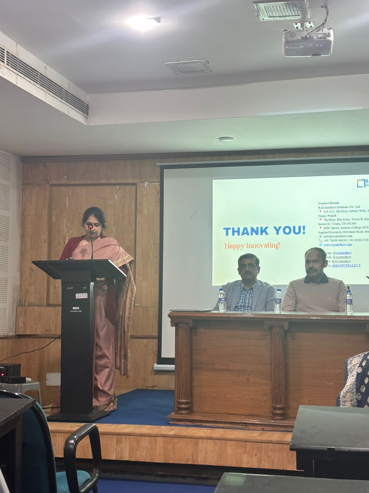 स्टूडेंट्स के साथ बातचीत के दौरान, डॉ. रुचि सिंगला ने इंटेलेक्चुअल प्रॉपर्टी राइट्स का कॉन्सेप्ट बताया और पेटेंट, कॉपीराइट, ट्रेडमार्क और इंडस्ट्रियल डिज़ाइन समेत IPR के अलग-अलग रूपों के बारे में बताया। उन्होंने पेटेंट फाइलिंग प्रोसेस, प्रायर आर्ट सर्च, पेटेंट डॉक्यूमेंट्स की ड्राफ्टिंग, इंटेलेक्चुअल प्रॉपर्टी के कमर्शियलाइज़ेशन के बारे में डिटेल में बताया और स्टार्टअप्स, रिसर्च और एंटरप्रेन्योरशिप में IPR की भूमिका पर चर्चा की। यह सेशन बहुत इंटरैक्टिव था, जिसमें पार्टिसिपेंट्स ने चर्चा की और पेटेंटेबिलिटी, टेक्नोलॉजी ट्रांसफर और इनोवेशन प्रोटेक्शन से जुड़े सवाल पूछे, जिन्हें असल ज़िंदगी के उदाहरणों और केस स्टडीज़ से सपोर्ट मिला। प्रोग्राम का अंत IIC के IPR कोऑर्डिनेटर डॉ. आशु बहल के फॉर्मल वोट ऑफ़ थैंक्स के साथ हुआ। प्रोग्राम में डॉ. दिनेश अरोड़ा, डॉ. राजीव पुरी, डॉ. निश्चय बहल, प्रोफ़ेसर पंकज गुप्ता, डॉ. पुनीत पुरी और प्रोफ़ेसर विशाल शर्मा मौजूद थे। डॉ. सीमा शर्मा ने सभी हॉस्पिटैलिटी अरेंजमेंट्स को अच्छे से देखा। स्टेज का संचालन प्रोफ़ेसर जसमीन कौर ने किया, जबकि प्रोफ़ेसर रंजीता ने अरेंजमेंट्स को अच्छे से कोऑर्डिनेट किया। सेशन सफलतापूर्वक खत्म हुआ, जिससे स्टूडेंट्स और नए एंटरप्रेन्योर्स के बीच IPR के बारे में अवेयरनेस काफी बढ़ी।