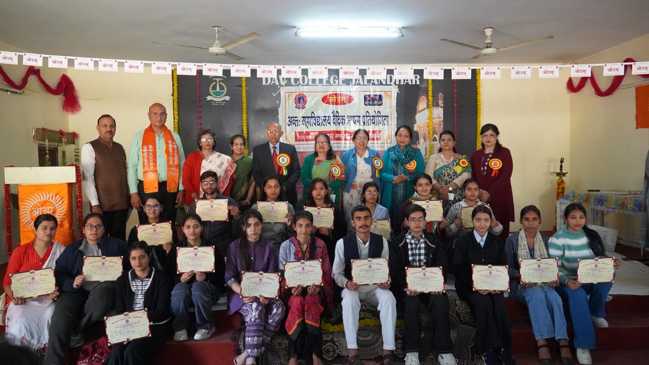 जालंधर (अरोड़ा) :- स्नातकोत्तर संस्कृत विभाग,डी.ए.वी.कॉलेज के तत्वावधान में तथा वेद प्रचार मंडल (रजि., जालंधर) के सहयोग से कालिदास संस्कृत परिषद् द्वारा अंतर-महाविद्यालय वैदिक भाषण प्रतियोगिता का आयोजन किया गया। इस अवसर पर संस्कृत चित्र प्रदर्शनी भी लगाई गई। कार्यक्रम का आयोजन वेद प्रचार मंडल के महासचिव रोशन लाल आर्य एवं प्राचार्य डॉ. अनुप कुमार की उपस्थिति में किया गया। समारोह की अध्यक्षता डॉ. नीलम सेठी (निदेशक, जी.आर.डी. ग्रुप ऑफ इंस्टीट्यूट्स, फगवाड़ा) ने की। मुख्य अतिथि विनीत धीर (मेयर) तथा विक्रांत वर्मा (सहायक आयुक्त, नगर निगम, जालंधर), कार्यकारी वरिष्ठ उप-प्राचार्य एवं स्नातकोत्तर भौतिक विभाग के विभागाध्यक्ष डॉ. कुॅंवर राजीव ने दीप प्रज्ज्वलित कर कार्यक्रम का शुभारंभ किया। डॉ. सोनिया मागो (प्राचार्य, स्वामी संत दास पब्लिक स्कूल) एवं पूर्व प्राचार्य प्रोमिला अरोड़ा (राजकीय कन्या वरिष्ठ माध्यमिक विद्यालय) ने प्रतिभागियों को बैच प्रदान किए। अतिथियों का स्वागत रोशन लाल आर्य, ज्योति स्वरूप कंबोज, बॉबी मल्होत्रा, प्रो. ऋतु तलवाड़, पूर्व प्राचार्य मधु शर्मा, अनीता कंबोज, प्राचार्य रीना वालिया तथा बोर्ड के अन्य पदाधिकारियों द्वारा किया गया। कार्यक्रम के आरंभ में वेद प्रचार मंडल के संस्थापक एवं प्रांतीय महासचिव रोशन लाल आर्य ने कहा कि मंडल युवाओं एवं विशेषकर विद्यार्थियों को शिक्षित करने के लिए कार्यरत्त है।