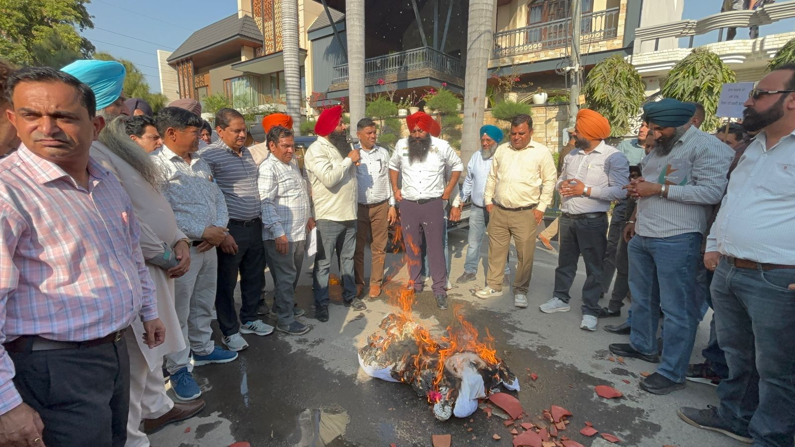 ਜਲੰਧਰ (ਅਰੋੜਾ) :- ਸੀ.ਪੀ.ਐਫ ਕਰਮਚਾਰੀ ਯੂਨੀਅਨ ਅਤੇ ਪੀ.ਐਸ.ਐਮ.ਐਸ.ਯੂ ਵੱਲੋਂ ਸਾਂਝੇ ਤੌਰ ਤੇ ਮੁੱਖ ਮੰਤਰੀ ਪੰਜਾਬ ਭਗਵੰਤ ਮਾਨ ਦਾ ਪੁੱਤਲਾ ਕੈਬਨਿਟ ਮੰਤਰੀ ਮਹਿੰਦਰ ਭਗਤ ਦੇ ਘਰ ਬਾਹਰ ਸਰਕਾਰ ਵਿਰੁੱਧ ਨਾਅਰੇਬਾਜ਼ੀ ਕਰਦੇ ਹੋਏ ਸਾੜਿਆ। ਸੀ.ਪੀ.ਐਫ ਕਰਮਚਾਰੀ ਯੂਨੀਅਨ ਪੰਜਾਬ ਦੇ ਸੂਬਾ ਪ੍ਰਧਾਨ ਸੁਖਜੀਤ ਸਿੰਘ ਡਿੰਪੀ ਨੇ ਦੱਸਿਆ ਕਿ ਪੰਜਾਬ ਸਰਕਾਰ ਮੁਲਾਜ਼ਮ ਮੰਗਾਂ ਤੇ ਲਗਾਤਾਰ ਟਾਲਮਟੌਲ ਕਰਦੀ ਆ ਰਹੀ ਹੈ। ਜਿਸ ਕਾਰਨ ਪੰਜਾਬ ਸਰਕਾਰ ਤੇ ਆਮ ਆਦਮੀ ਪਾਰਟੀ ਪ੍ਰਤੀ ਪੰਜਾਬ ਦੇ ਮੁਲਾਜ਼ਮਾਂ ਤੇ ਪੈਨਸ਼ਨਰਾਂ ਵਿੱਚ ਸਰਕਾਰ ਪ੍ਰਤੀ ਭਾਰੀ ਰੋਸ ਹੈ। ਉਨ੍ਹਾਂ ਅੱਗੇ ਕਿਹਾ ਕਿ ਪੰਜਾਬ ਸਰਕਾਰ ਤੇ ਮੁੱਖ ਮੰਤਰੀ ਪੰਜਾਬ ਦੀ ਕਹਿਣੀ ਤੇ ਕਥਨੀ ਵਿੱਚ ਬਹੁਤ ਵੱਡਾ ਫਰਕ ਹੈ ਕਿਉਕਿ ਅੱਜ ਤੱਕ ਕੋਈ ਵੀ ਸਰਕਾਰ ਮੁਲਾਜ਼ਮਾਂ ਨਾਲ ਮੀਟਿੰਗਾਂ ਕਰਨ ਤੋਂ ਨਹੀਂ ਭੱਜੀ ਪਰ ਮੌਜੂਦਾ ਪੰਜਾਬ ਸਰਕਾਰ ਮੁਲਾਜ਼ਮਾਂ ਨਾਲ ਕੀਤੇ ਹੋਏ ਵਆਦਿਆਂ ਤੋਂ ਤਾਂ ਭੱਜ ਹੀ ਰਹੀ ਹੈ ਬਲਕਿ ਸਰਕਾਰ ਵੱਲੋਂ ਜਾਰੀ ਕੀਤੇ ਗਏ ਨੋਟੀਫਿਕੇਸ਼ਨ ਜਾਰੀ ਕਰਨ ਤੋਂ ਨਾਂਹ ਕੀਤੀ ਜਾ ਰਹੀ ਹੈ।