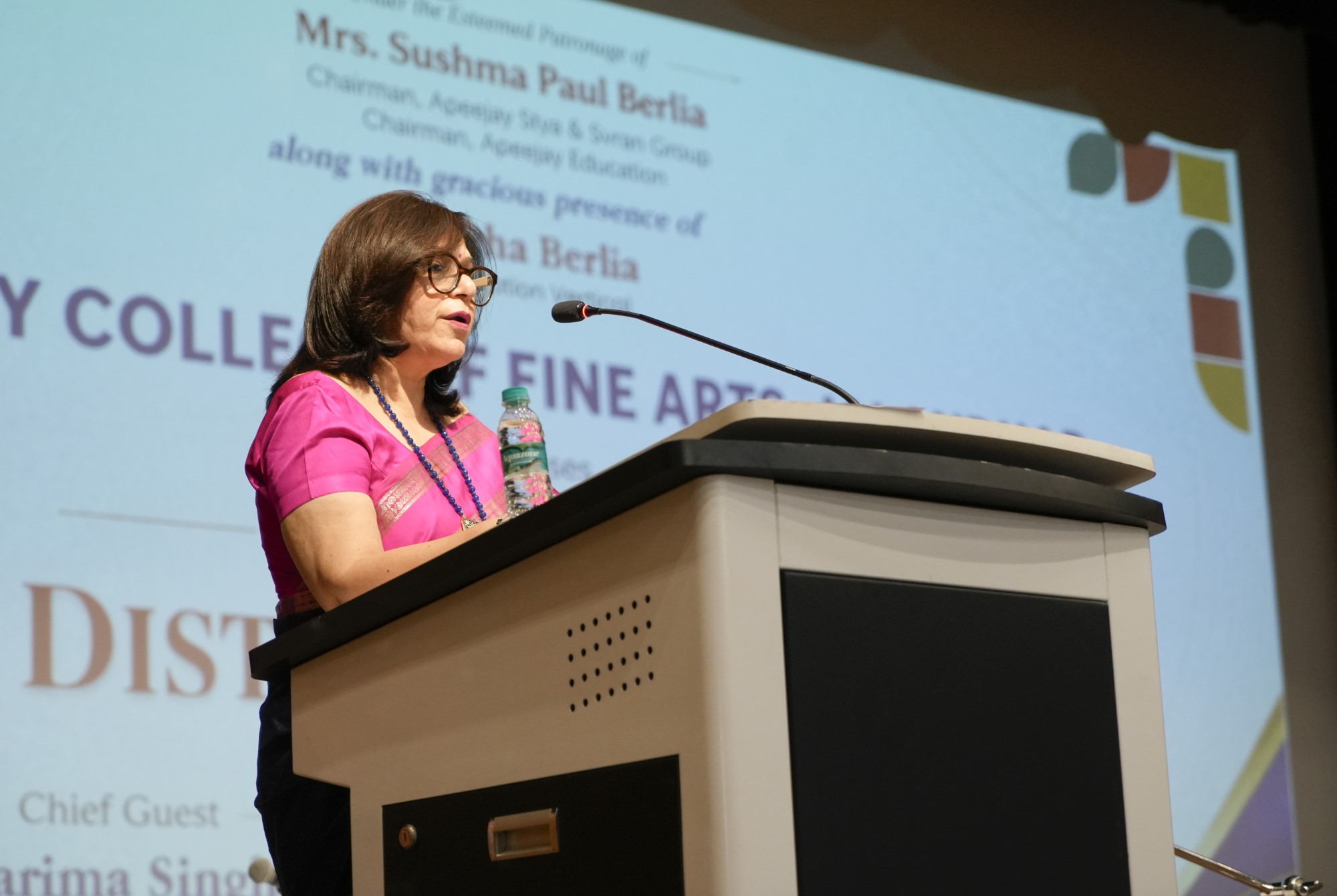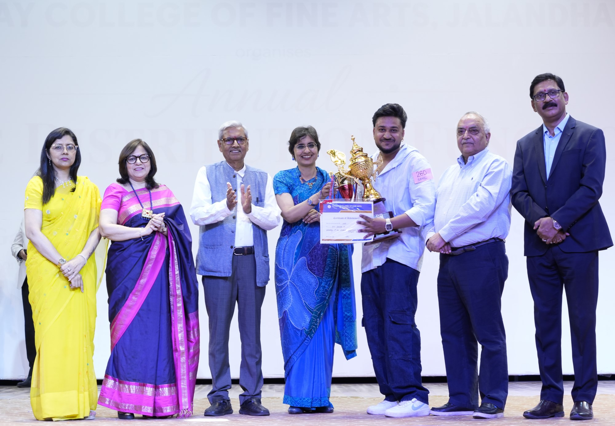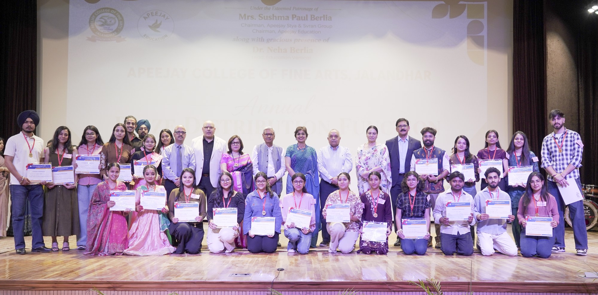 डॉ ढींगरा ने कॉलेज की वार्षिक रिपोर्ट पढ़ते हुए कॉलेज की उपलब्धियों से सभी को परिचित करवाते हुए कहा कि कालेज ने न केवल शिक्षा,सांस्कृतिक बल्कि खेलों के क्षेत्र में भी श्रेष्ठ उपलब्धियों को हासिल करते हुए अपना नाम उत्तर भारत के श्रेष्ठ शिक्षण संस्थानों में दर्ज किया है और भविष्य में भी हमारा कॉलेज इसी तरह निरंतर अपने कदम आगे बढ़ाता रहेगा। एपीजे सत्या एंड स्वर्ण ग्रुप, लीड एजुकेशन वर्टिकल ऑफिस बियरर एपीजे एजुकेशन डॉ नेहा बर्लिया ने पुरस्कार प्राप्त करने वाले विद्यार्थियों को संबोधित करते हुए कहां की जिंदगी में पुरस्कार प्राप्त करने हेतु अपने दिन रात एक किया होगा परन्तु यह तो जीवन का एक पक्ष है अब आपको जिंदगी में आगे बढ़ते हुए इस तरह से कड़ी मेहनत एवं जुनून से काम करना है कि आप समाज की हर जीव के साथ सामजस्य स्थापित कर सके।डॉ नेहा ने कहा कि मैं अपने नाना डॉ सत्यपाॅल जी की सोच को नमन करती हूं जिनकी दृढ़ अवधारणा थी कि मूल्य आधारित शिक्षा देकर हम विद्यार्थियों के व्यक्तित्व के सर्वांगीण विकास के साथ-साथ उनको आत्मिक स्तर पर भी पोषित कर सकते हैं।उन्होंने कहां की एपीजे एजुकेशन की अध्यक्ष सुषमा पॉल बर्लिया जी अपने पिता के सपनों को साकार करने के लिए उनकी धरोहर को सार्थक ढंग से युवा पीढ़ी तक पहुंचाने के लिए निरंतर प्रयत्नशील है और हम भी इसी परंपरा को आगे बढ़ाने के सार्थक प्रयत्न करते रहेंगे। इस अवसर पर परफॉर्मिंग आर्ट्स विभाग की छात्रा ने शिव स्तुति, कृष्ण के जीवन पर आधारित ठुमरी पर आधारित क्लासिकल नृत्य की भावमय प्रस्तुति करते हुए सभी को आत्मविभोर कर दिया। इस समारोह में एपीजे एजुकेशन की अध्यक्ष सुषमा पॉल बर्लिया के सफलतम जीवन पर आधारित शॉर्ट वीडियो भी दिखाई गई। पुरस्कार वितरण समारोह में डॉ गरिमा सिंह, दिनेश राय, डॉ सुचरिता शर्मा नीरजा ढींगरा मल महाजन, डॉ राजेश बग्गा ने यूनिवर्सिटी एवं कॉलेज में टॉप पोजीशंस हासिल करने वाले 144 विद्यार्थियों को मैडल, प्रमाण-पत्र एवं नगद राशि देकर सम्मानित किया। यूथ फेस्टिवल फोरम, मेक फोरम,एस डब्ल्यू ए, एनएसएस में श्रेष्ठ प्रदर्शन करने वाले 131 विद्यार्थियों को भी प्रमाण-पत्र एवं नगद राशि देकर सम्मानित किया गया। इस समारोह को अविस्मरणीय बनाने के लिए संगीत विभाग के विद्यार्थी द्वारा प्रस्तुत वेस्टर्न इंस्ट्रूमेंटल ड्रम की प्रस्तुति ने सबको मंत्रमुग्ध कर दिया। इस अवसर पर मुख्य अतिथि मैडम गरिमा सिंह ने अपने विचार व्यक्त करते हुए कहा कि अगर पहले मैं एपीजे कॉलेज आफ फाइन आर्ट्स में आ जाती तो शायद मैं आज इंडियन सर्विसेज में न होकर एक आर्टिस्ट होती। टीचर्स को संबोधित करते हुए उन्होंने कहा कि आप विद्यार्थियों के लिए रोल मॉडल बने और उनके बीच छुपी प्